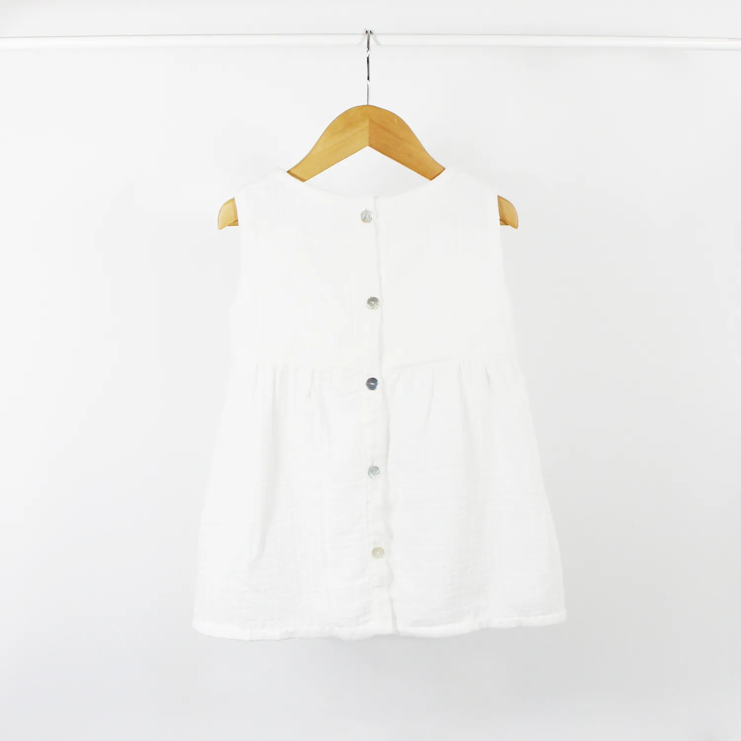 Cette robe cérémonie enfant en double gaze plumetis est confectionnée dans une double gaze de coton bio GOTS. De jolis boutons en nacre, pour entièrement boutonner de cette jolie robe cérémonie blanche.